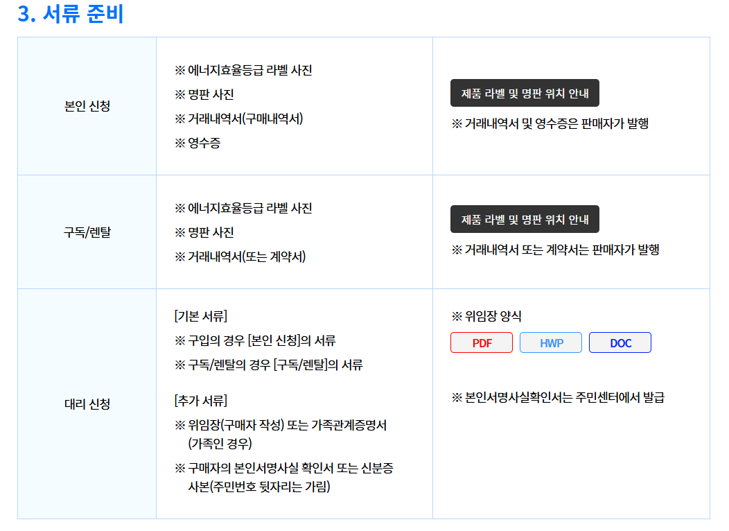 | 서류 준비 | 효율 등급 라벨 및 시리얼 번호 사진 필수 |