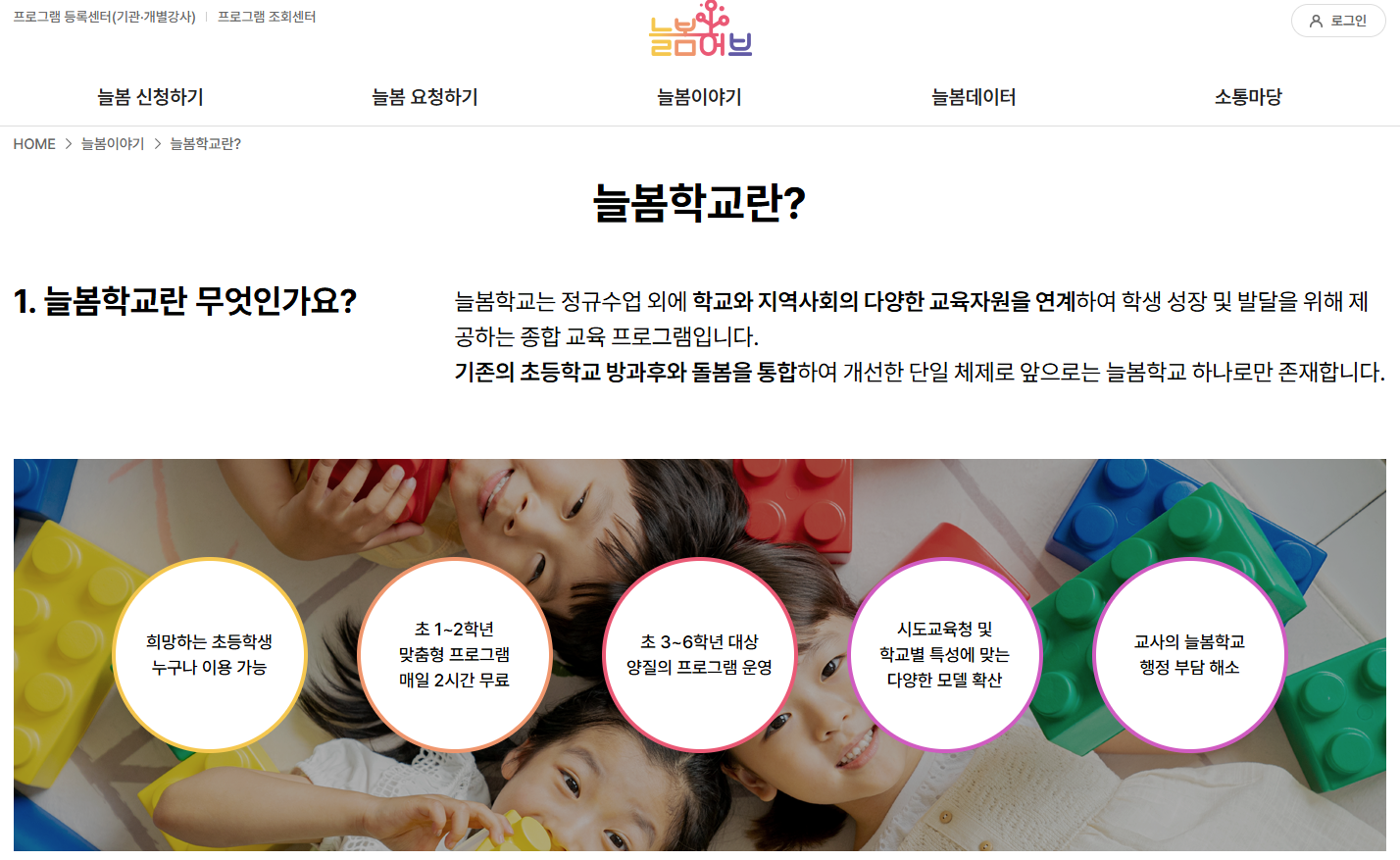 늘봄학교는 초등학생의 방과 후 돌봄과 학습을 국가가 책임지는 공적 서비스입니다. 정규 수업 전후 시간에 안전하고 체계적인 돌봄 및 교육 프로그램을 제공하며, 맞벌이 가정과 학부모들의 육아 부담을 덜어줄 수 있는 국가 주도 지원 사업입니다.