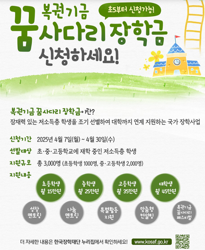 복권기금 꿈사다리 장학금은 경제적 어려움 속에서도 꿈을 향해 나아가는 학생들에게 큰 힘이 되는 제도입니다. 2025년에는 지원 대상과 규모가 확대되어 더 많은 학생들이 혜택을 받을 수 있게 되었습니다. 해당 요건에 부합하는 학생들은 꼭 신청하여 꿈을 향한 첫걸음을 내딛길 바랍니다.