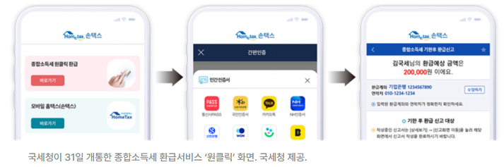 국세청은 국민들이 손쉽게 환급금을 조회하고 신청할 수 있도록 ‘홈택스’와 ‘손택스(모바일)’에서 원클릭 서비스를 제공하고 있어요.