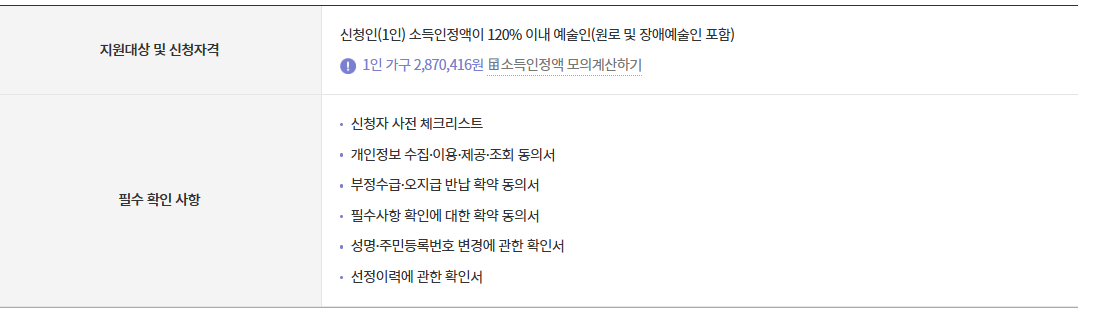 - (기준 중위소득 120%) 보건복지부 고시 기준 1인 가구 2,870,416원