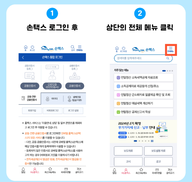 국세청 홈택스(https://www.hometax.go.kr) 접속 후 로그인