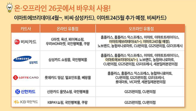 - 이마트, 홈플러스, 농협하나로마트, CU편의점, GS25편의점 등