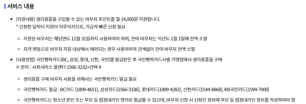 1. 지원 내용: 월 14,000원의 생리용품 구매비 지원