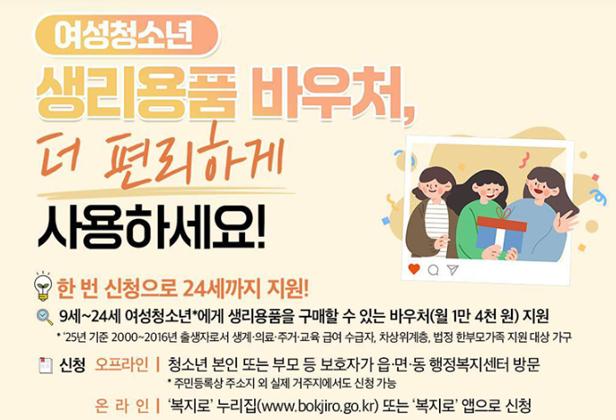 여성청소년의 건강한 성장을 지원하기 위해 정부는 2025년 여성청소년 생리용품 바우처 지원 사업을 시행하고 있습니다.